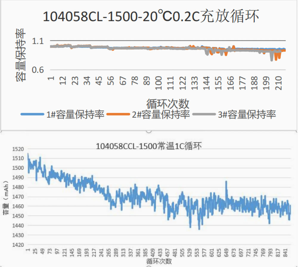 Cycle Life: 25℃ 1C 1000 cycles≥80%; -20℃ 0.2C 300 cycles≥90%